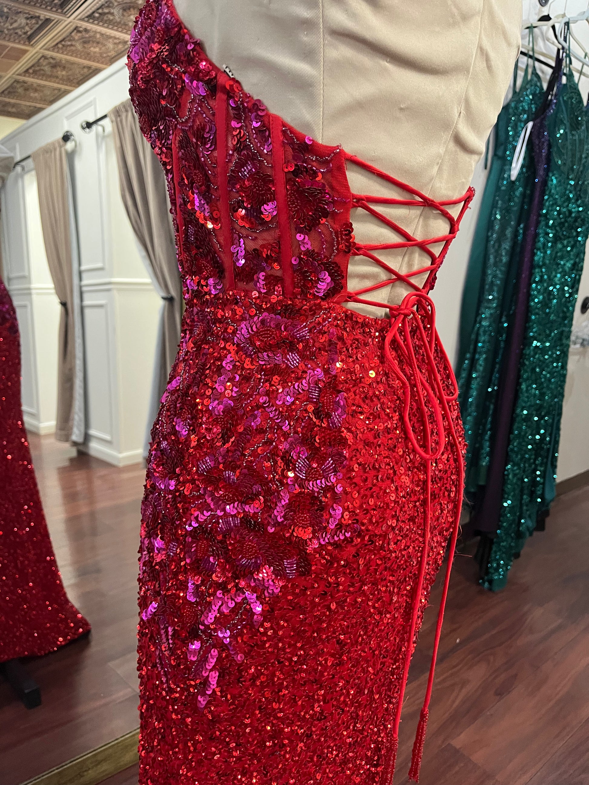 This stunning Sherri Hill prom dress features a gorgeous red design with eye-catching pink details. A true statement piece that’s sure to turn heads.